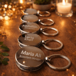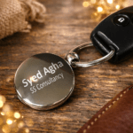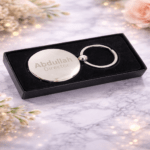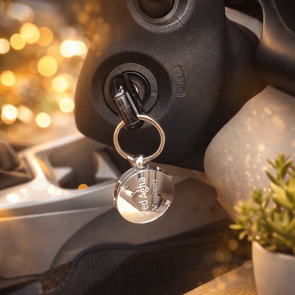 Elegant Round Design: A sleek and modern all-metal keychain, expertly engraved with your Name, Company Name, or Designation for a personalized touch.