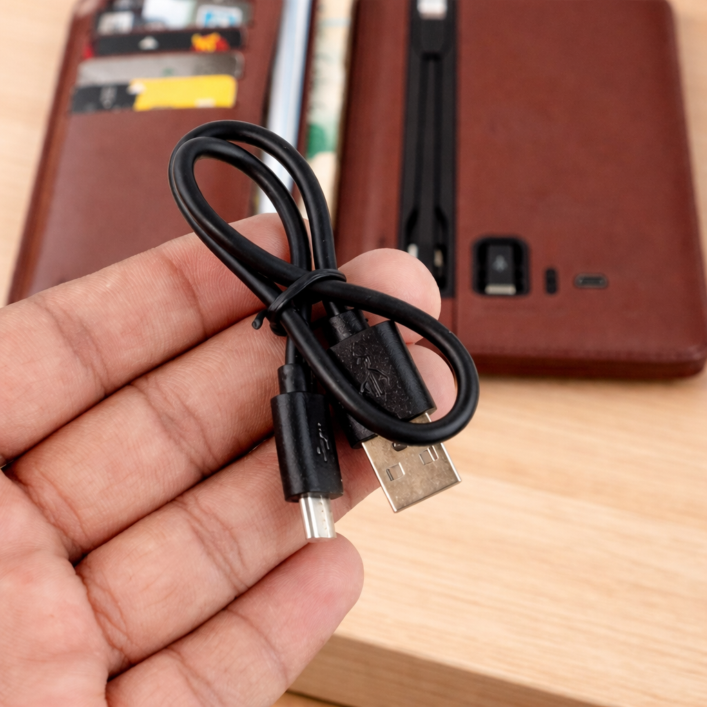 - Power bank recharges with micro-USB cable (included with wallet)