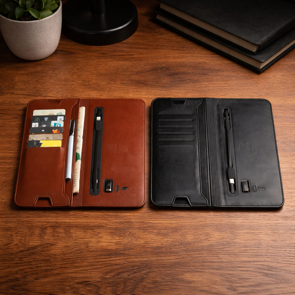 - Smart wallet with built-in power bank for wireless and wired charging